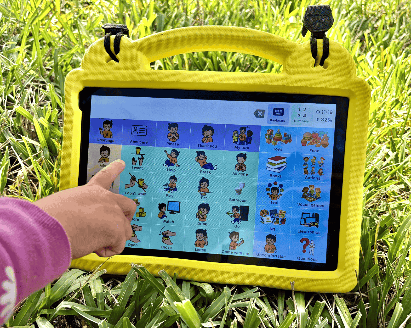 Each card in a Sawti tablet plays a verbal model when tapped, allowing users to consistently hear and associate the spoken word with its corresponding picture and action. This repetition supports language comprehension and word imitation. Sawti also includes ABA-based features such as the focus on functional communication, visual supports, delayed prompting options, and emotional regulation tools.